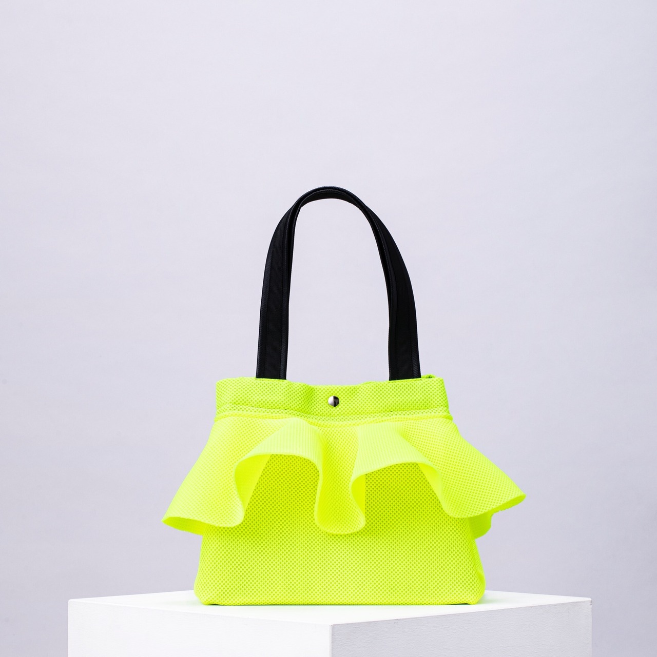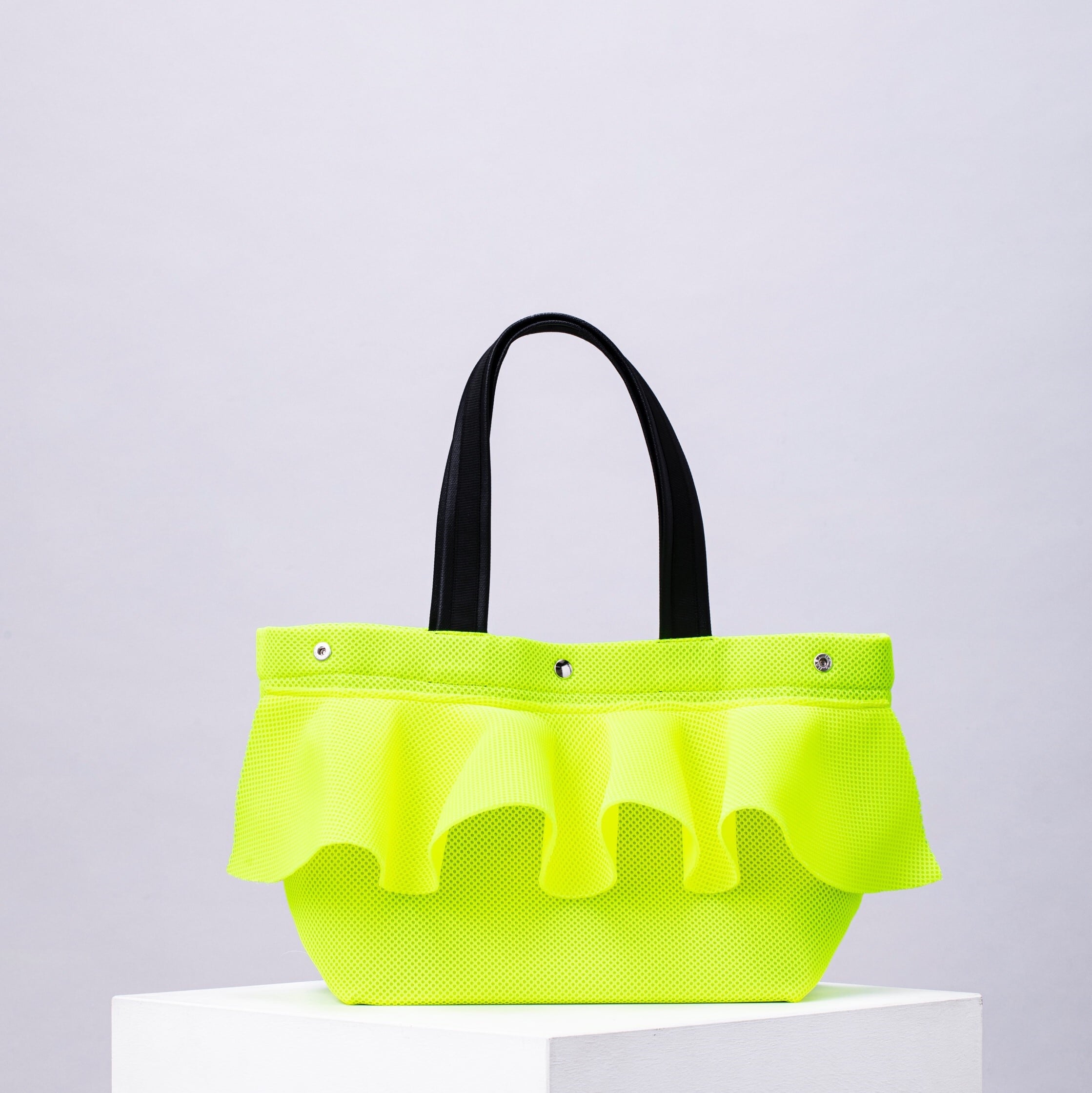 Ruffle Tote in size M, featuring three-dimensional frills and PVC handles.